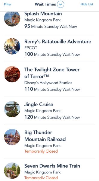 The surprising thing is that even though the crowds were bad today…the wait times weren’t! Midday, there weren’t any rides in Disney World with waits over 2 hours and some of the heavy hitters were hovering around an hour-long wait instead.
