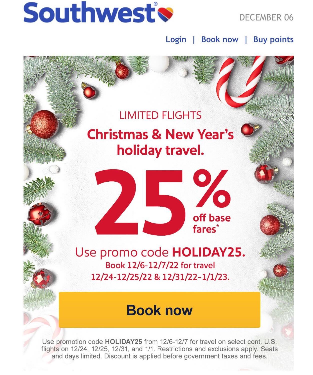 Right now, you can save 25% on base fares on select Christmas & New Year’s flights through Southwest!