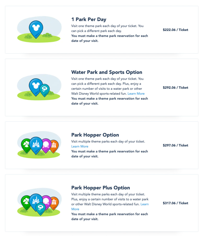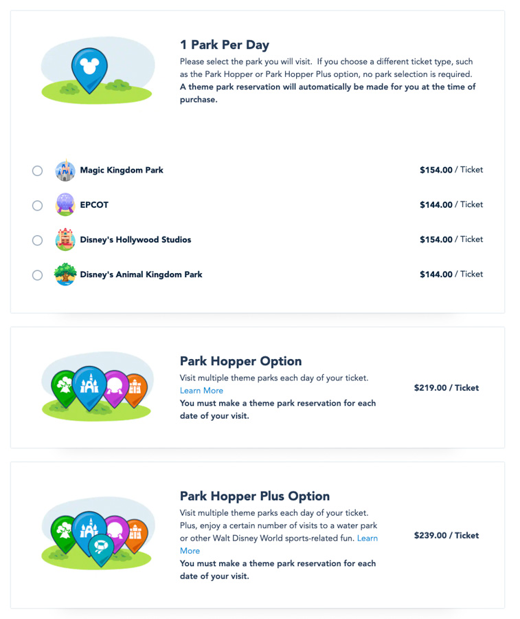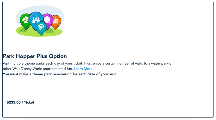 The Park Hopper and Park Hopper Plus add ons are the same for any park you visit, but we want to show you the difference between the cost of a single day ticket and a ticket with the add on since the prices for single day tickets is different for each park now.