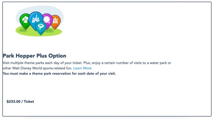 As for Park Hopper Plus, that add on is $233 per ticket for today. That’s $94 more than EPCOT’s single day ticket, $84 more than Hollywood Studios’, and $99 more than Animal Kingdom’s.