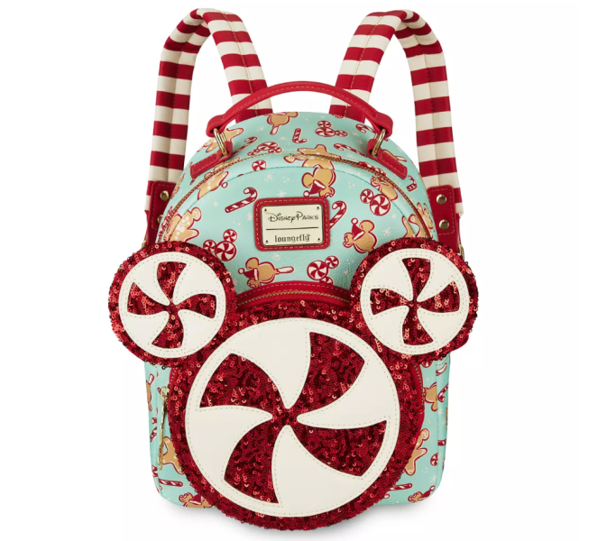 This cute backpack is in a perky light blue and bright red color scheme. It has adorable candy cane straps and a giant Mickey icon on the front made of sparkly peppermint candies! This is another piece available on shopDisney too.