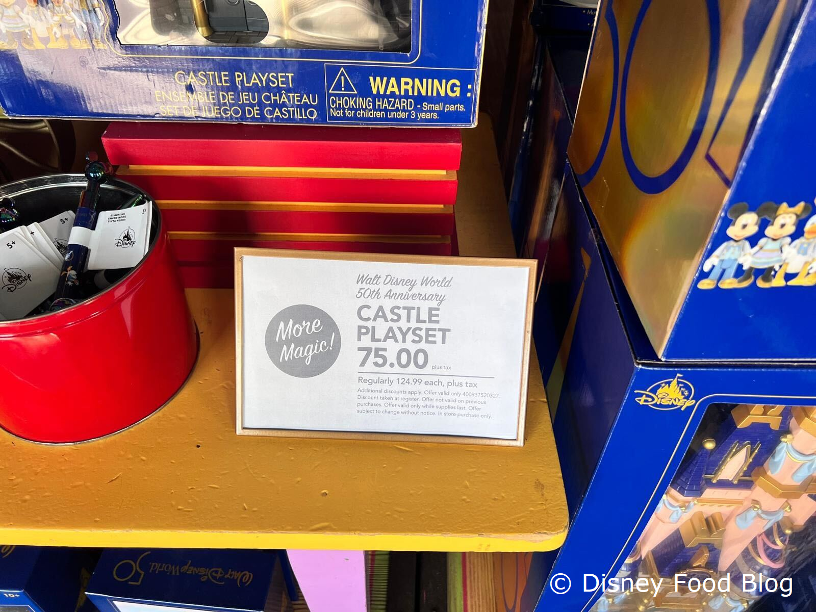 Along with accessories, there are sales on toys too. What a great chance to snag some presents to bring home to your family! Both the 50th Anniversary Castle Playset and Monorail Playset are discounted in the parks. The castle playset, normally $124.99, is marked down to just $75.
