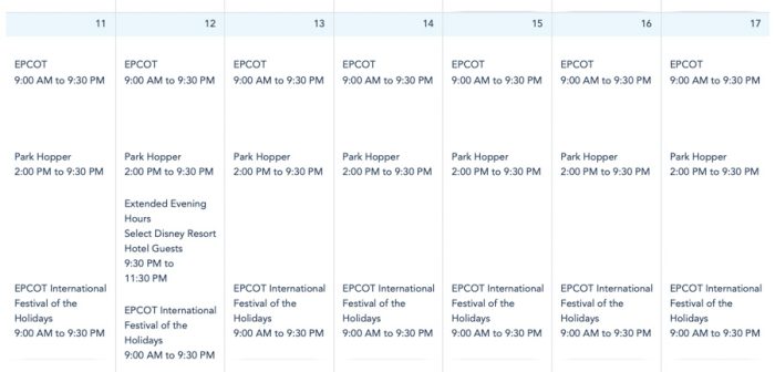 EPCOT will be open from 9AM to 9:30PM from December 11th to the 17th.