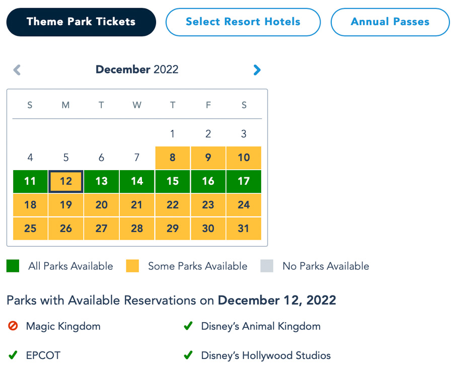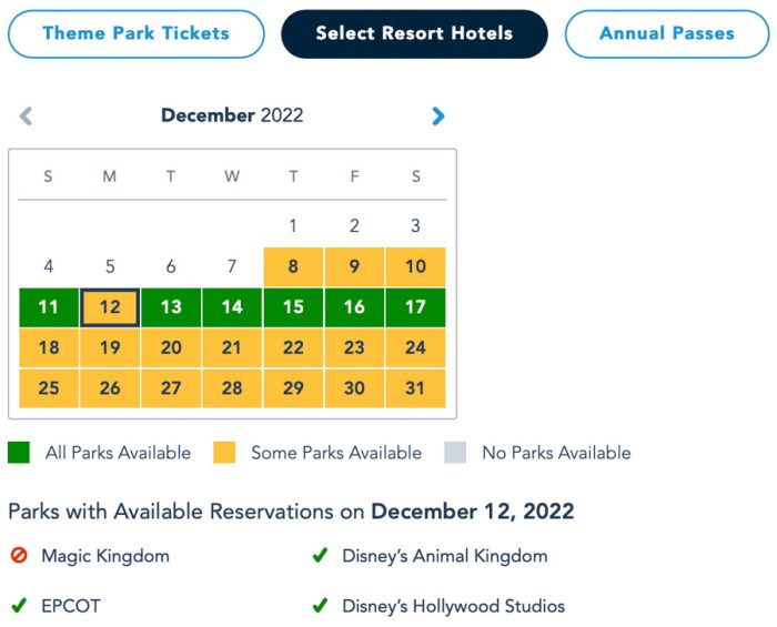 If you’re staying at a Disney World hotel, the availability is the same as it is with the theme park tickets. Magic Kingdom is booked up for December 12th. The rest of the week is fully available.