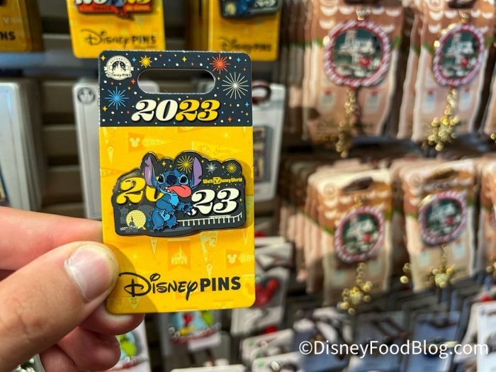 Stitch ALSO has his own 2023 pin, where fireworks explode above the park icons and monorail behind him.