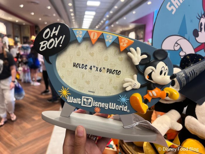 The Mickey Mouse Photo Frame features Mickey Mouse on a fun retro-inspired design. It has the year in a banner across the top, as well as a speech bubble with Mickey’s catch phrase! Get this for $24.99 in the parks, or order one online for $29.99.
