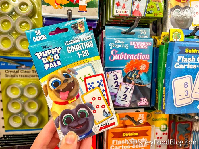 If you have kiddos who are learning counting or subtraction, we spotted some learning card sets with Disney characters on them. There was a Puppy Dog Pals set for counting from 1-20 and a Merida set for learning subtraction. That’ll make math a little more fun!