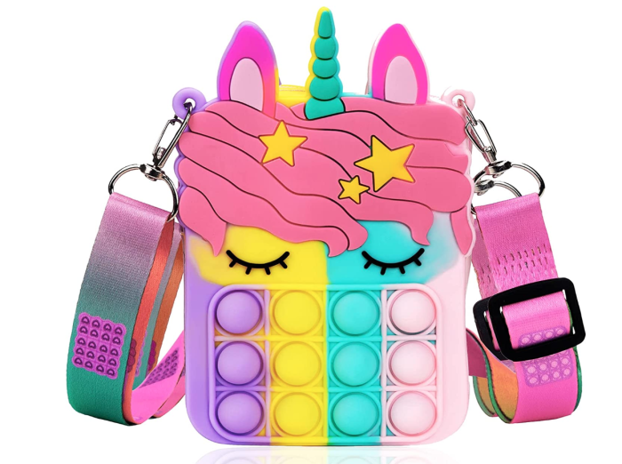 If you’ve stepped foot in the toy aisle of any store this year, then you know that pop-it toys are very popular. That’s why this Small Unicorn Pop Purse would be a great gift!
