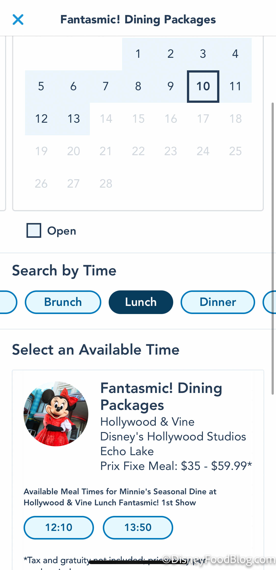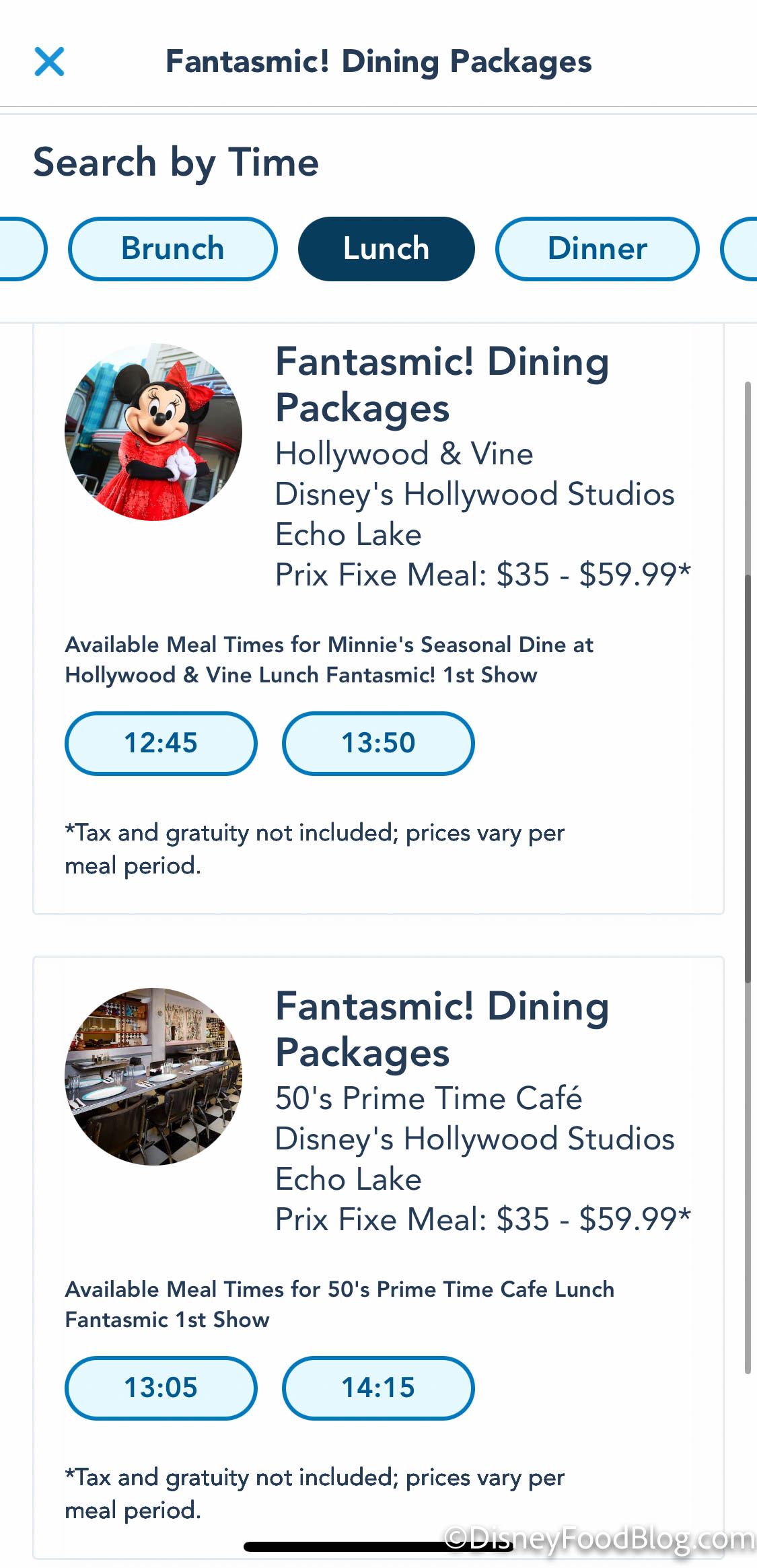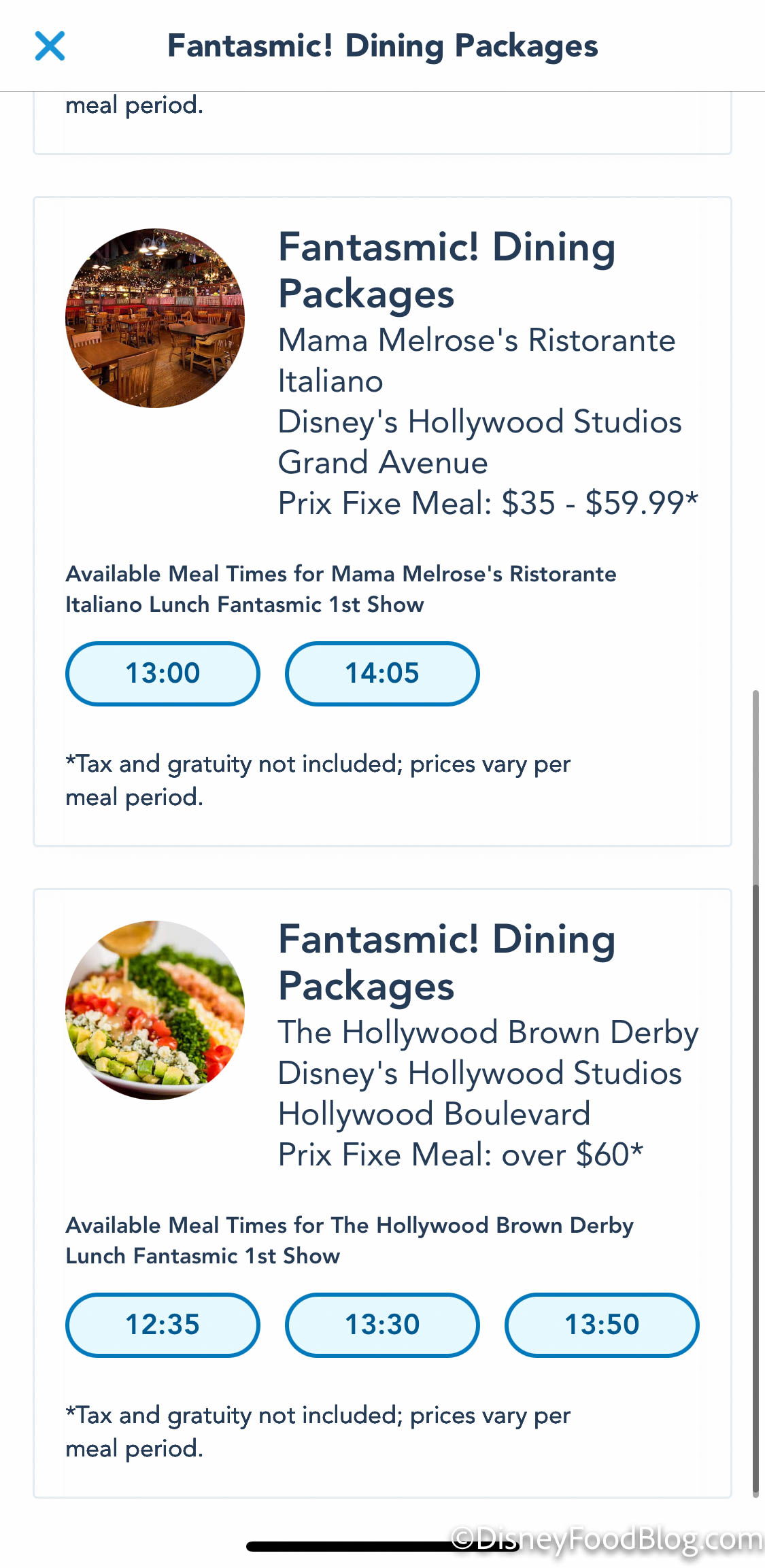 To find them in the app, tap the search icon at the bottom of the screen (toward the right). Then search “Fantasmic!” and you should see the dining packages option appear. You can then select “reserve dining” and see what’s available.