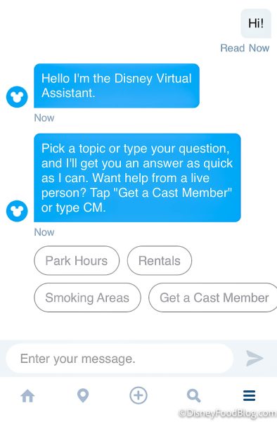 Now, when you navigate to the chat, you can type in an initial message and the virtual assistant will pop up. The virtual assistant presents a variety of topics you can ask about (like park hours, rentals, and smoking areas) or you can tap “Get a Cast Member” to speak with a Disney employee.