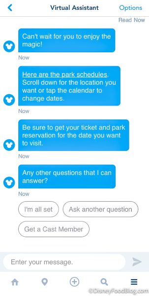 While the virtual assistant function can’t answer all of your questions, it can be helpful to get some basic (and sometimes critical) information in a faster way than waiting for a Cast Member to be available via chat. So, the next time you have a basic question, head to the chat and see if the virtual assistant can help. If not, you can tap the “Get a Cast Member” to speak with someone, call Disney directly, or speak with Cast Members in the parks.