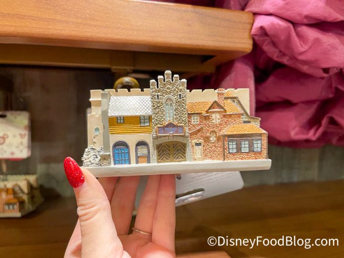 The front of the ornament shows the front of the ride building and the buildings surrounding it. It is so beautifully detailed for a small little ornament — just look at the roof shingles and the rock work. Can’t you just feel the pavement below your feet and smell the School Bread nearby?!