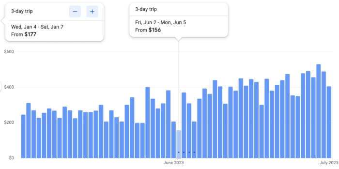 We searched for data about flight costs for a 3-day trip to the Orlando International Airport, which is displayed in the graphs below. Note that the scale for the flight costs changes, so keep an eye on the numbers along the y-axis of the graphs. When flights got more expensive overall, Google Flights updated this scale.