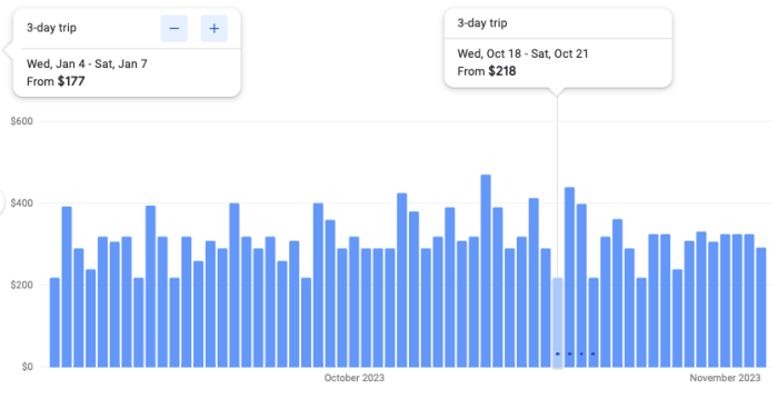 Note the shift in scale with the September and October graph. These flights are pretty expensive, and there aren’t many valleys in the prices.