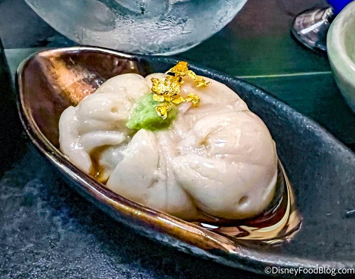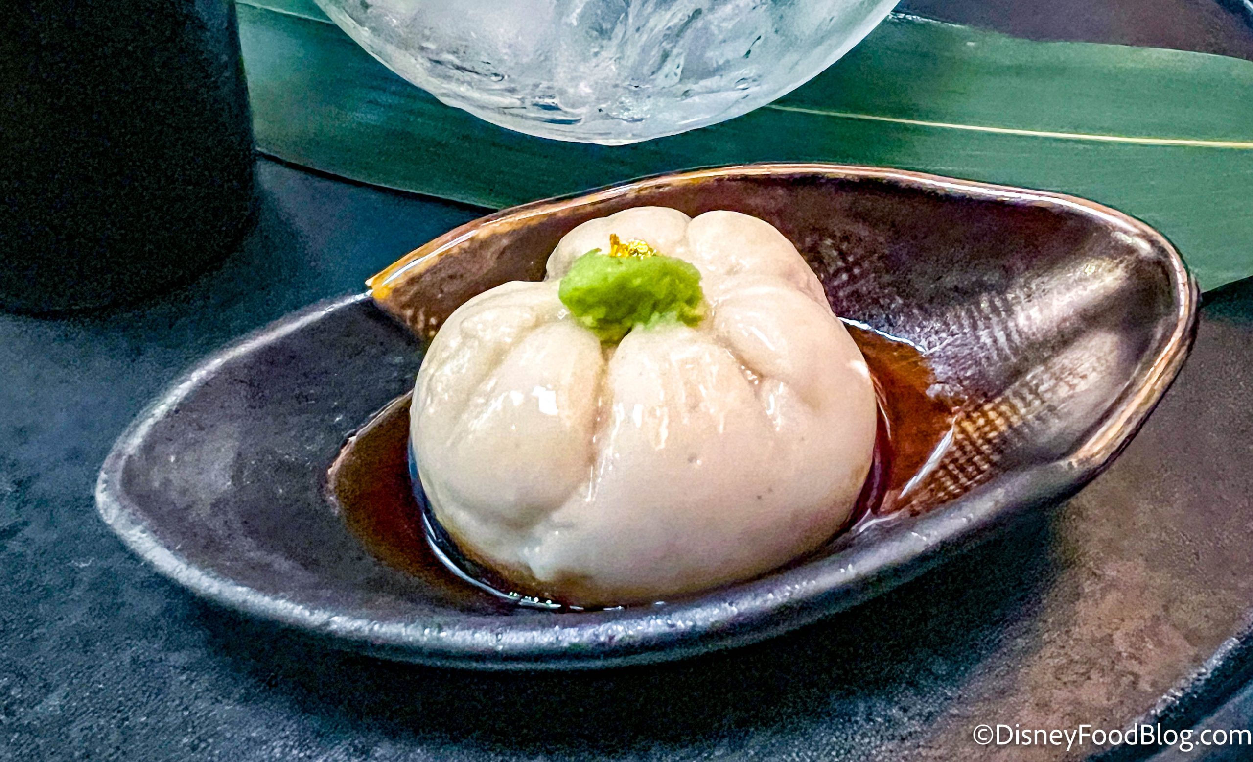 The dumpling we got was almost like a pudding, but savory! Sesame was the flavor we tasted the most. Just note that picking this up can be a bit tricky. There was a little dot of wasabi on it that we would have liked to have spread a bit more evenly, but the consistency of the bun didn’t quite allow us to do that so keep in mind that one spot may have a stronger wasabi flavor than others.