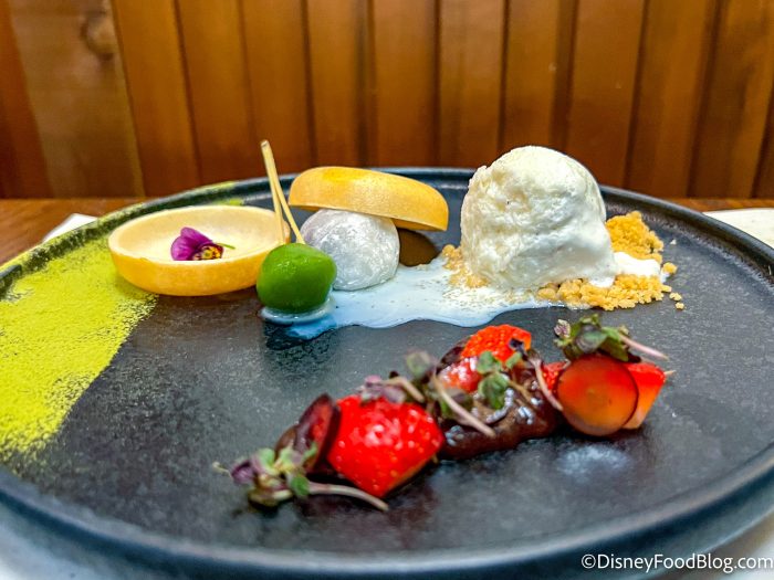 The fruit included was strawberries and sliced grapes. Our advice would be to eat this all together. Take a bite of your mochi sandwich, then eat a spoonful of the ice cream, and get some of the crumble and fruit. For us, it was like the scene in Ratatouille where Remy eats the cheese and strawberry together. The blending of flavors was fantastic and wonderfully light — serving as the perfect ending to the meal.