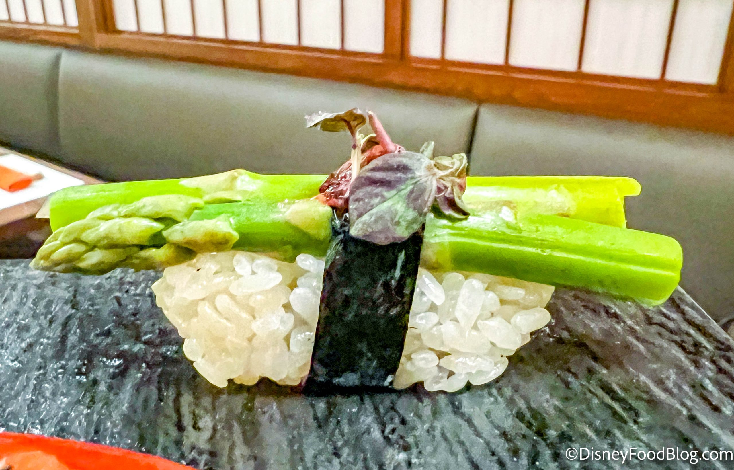 We also got an asparagus roll. This had a seaweed flavor that came through upon the first bite, but then something within the roll exploded and provided a suddenly fruity (yet still savory flavor). It turns out that the lovely fruit flavor was from the plum that was included in the dish! It was a fun surprise and wonderful addition to this roll.