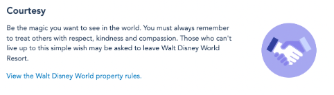 The message continues when you click on “Read More,” and says, “You must always remember to treat others with respect, kindness and compassion. Those who can’t live up to this simple wish may be asked to leave Walt Disney World Resort.” There’s also a link to view the Disney World property rules.