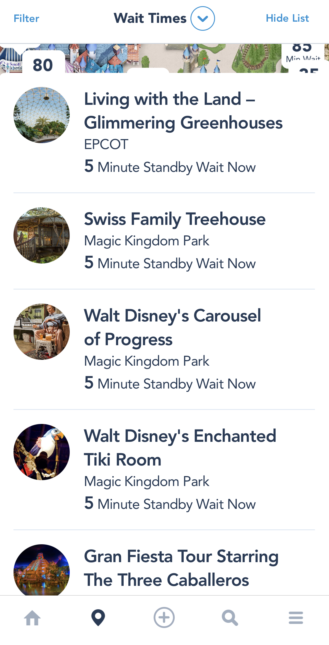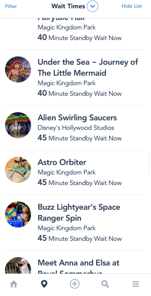 But there were plenty of rides with wait times right in the middle range — around 45 minutes or less, including Buzz Lightyear’s Space Ranger Spin, Journey of the Little Mermaid, and even Space Mountain (it was at a 35-minute wait when we checked!).
