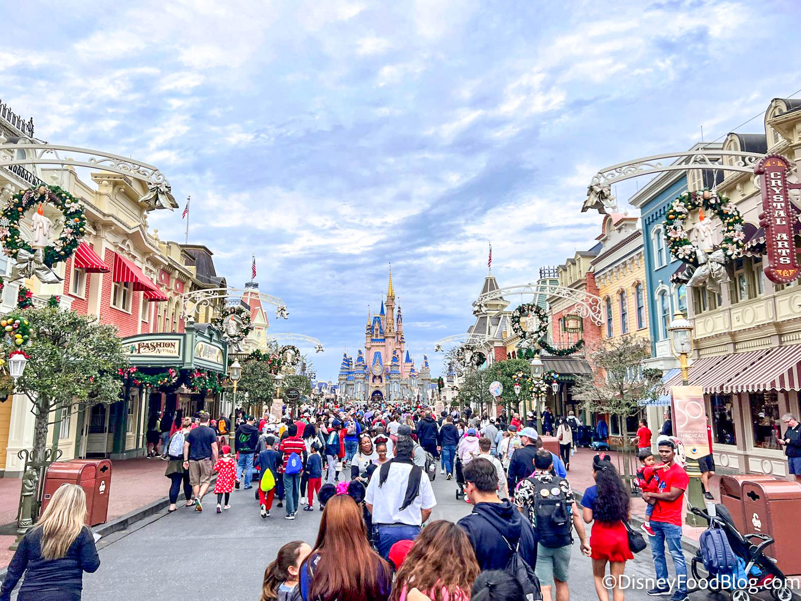 The crowds didn’t go away on December 23rd, either! Here’s a look at Main Street, U.S.A. heading toward Cinderella Castle in Magic Kingdom.
