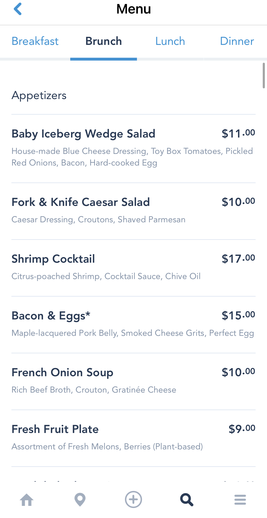 You can also see the brunch menu on the My Disney Experience app. There are a number of appetizers, including bacon and eggs and french onion soup.