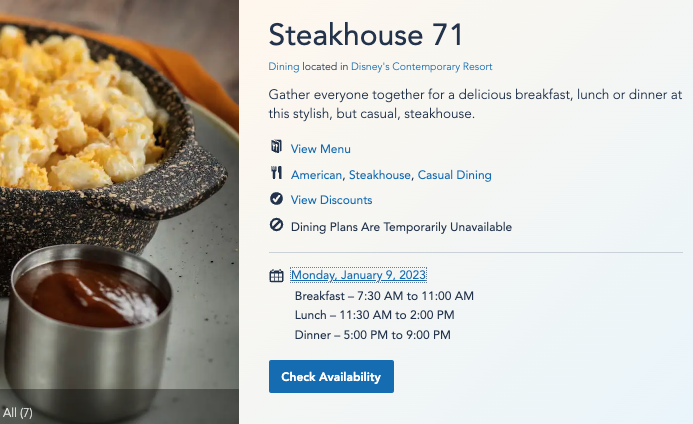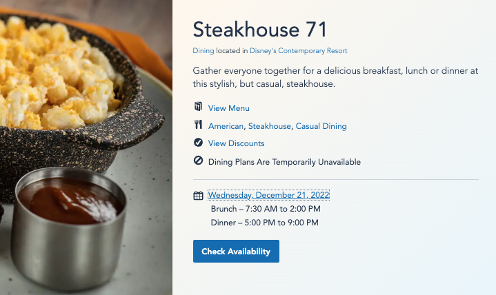 Looking to grab brunch with the family during the holidays? Well, then it’s time for you to run on over to Steakhouse 71 at Disney’s Contemporary Resort. This spot normally serves up breakfast, lunch, and dinner as 3 separate services, but if you visit now you might be able to catch their brunch menu! We shared a bit about this in another post but wanted to highlight it again in case it’s something you haven’t realized is happening right now!