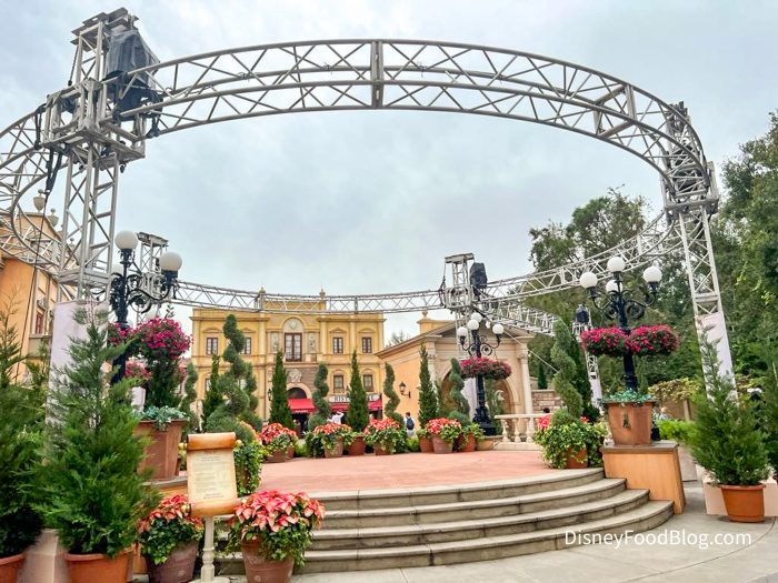 Over at the Italy Pavilion in the World Showcase in EPCOT, we found what looks to be the first setup to prepare for some New Year’s Eve celebrations. There appears to be a large, circular lighting rig set up in the plaza area!
