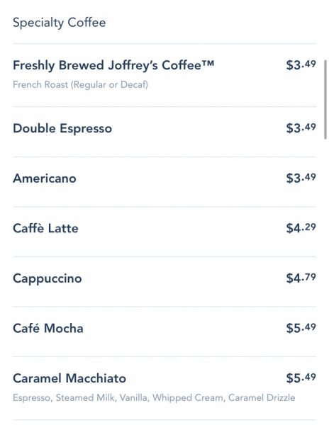 Of course, it wouldn’t be a coffee shop without lots of coffee drinks! Joffrey’s Coffee will be sold here, and you can also choose a Double Espresso, American, Caffè Latte, Cappuccino, Café Mocha, or Caramel Macchiato. The coffee drinks cost between $3 and $6 per cup.