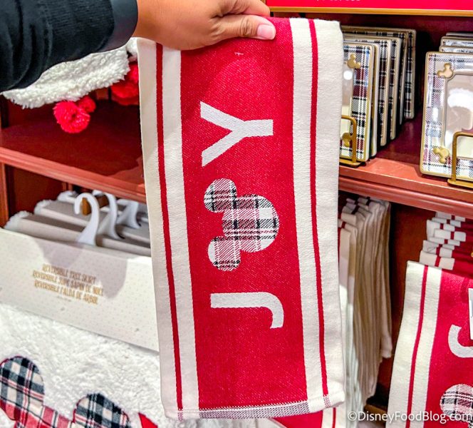We also spotted a new item in Disney’s holiday collection, which is a kitchen towel that says “Joy.”