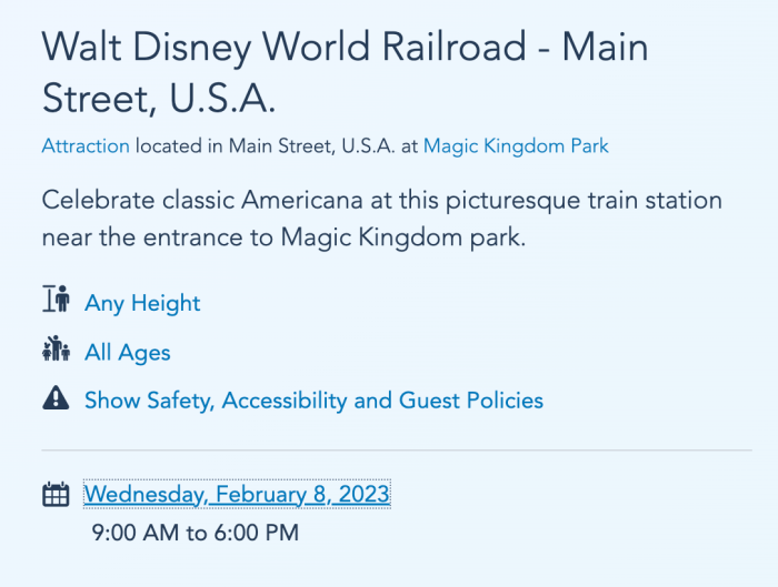 If you’re hoping to ride the train, you can check out the attraction’s hours here. Right now, Disney’s website is showing that the train will be open from 9AM-6PM daily until January 30th. That changes on January 31st, when the train runs from 9AM-3:30PM. (Magic Kingdom closes at 4:30PM that day.)