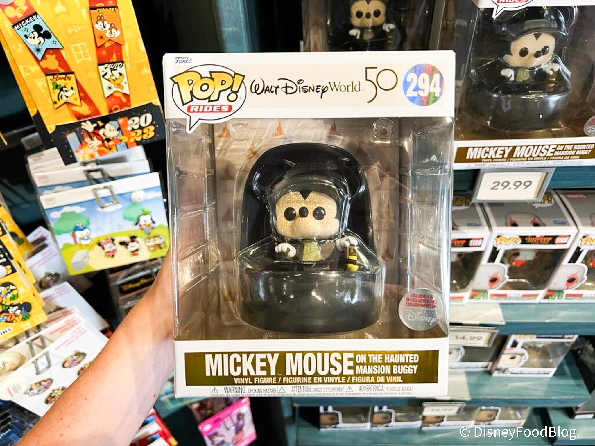Today, in Disneyland, we spotted this spooky Funko Pop! Ride vinyl figure, featuring Mickey Mouse in one of the iconic Doom Buggies from The Haunted Mansion.