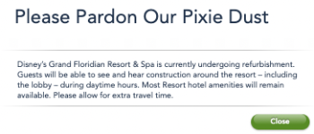 And the renovations continue! The Disney World website does warn that the hotel “is currently undergoing refurbishment. Guests will be able to see and hear construction around the resort – including the lobby – during daytime hours.” But, they note that “Most Resort hotel amenities will remain available.”