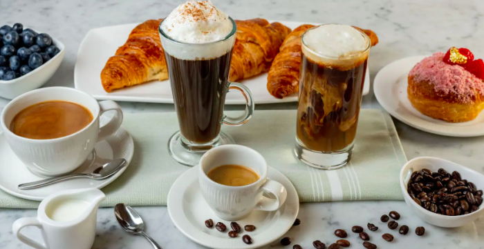 The menu lists a variety of pastries, as well as multiple different coffee options like cappuccinos and americanos. They also have specialty iced coffee and tea selections so you can get your caffeine fix before you hit the parks.