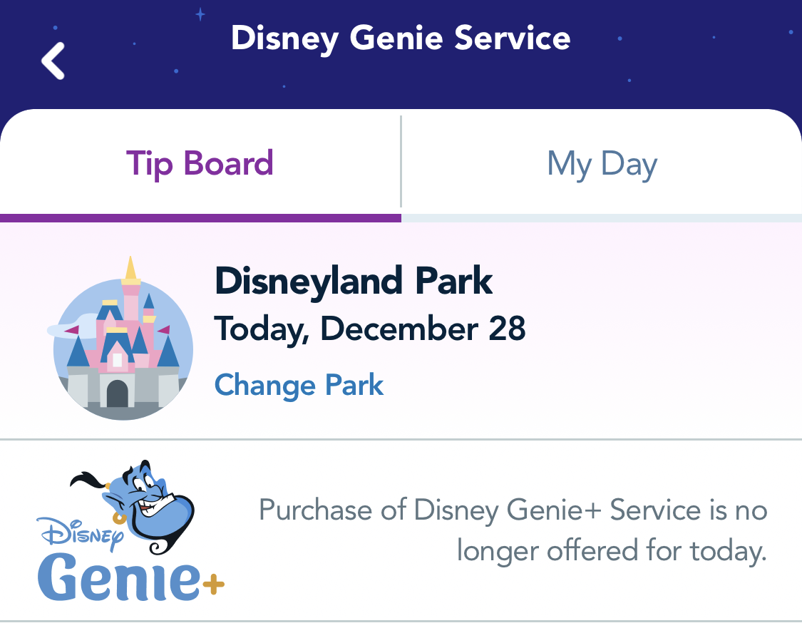 On December 28th, the standard Genie+ service SOLD OUT at Disneyland Resort. When we looked at the Disneyland app, the Tip Board indicated that the purchase of the Genie+ service was no longer offered for the day. This was around 4:35PM ET (1:35PM PT). UPDATE: Genie+ also sold out on December 29th.