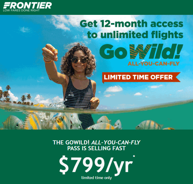So what exactly is the GoWild! Pass? Well, it’s a yearly pass that lets you fly ANYWHERE at ANY TIME (with some restrictions) throughout the year. Sound good? Well, you might want to know how much it costs. Normally, the GoWild! pass is $1,999 per year, BUT for a limited time, you can get it for $799!