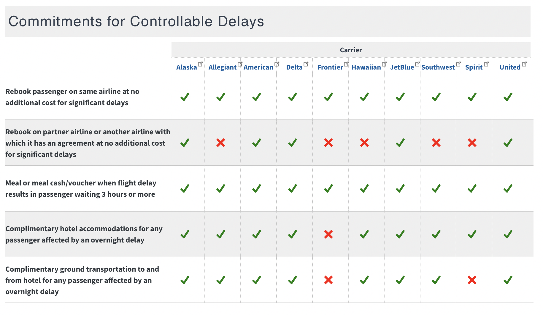 The other chart on this page is for “Commitments for Controllable Delays” which pertains to any travelers experiencing a flight delay. The chart works the same way and includes many situations that your airline may or may not assist with.