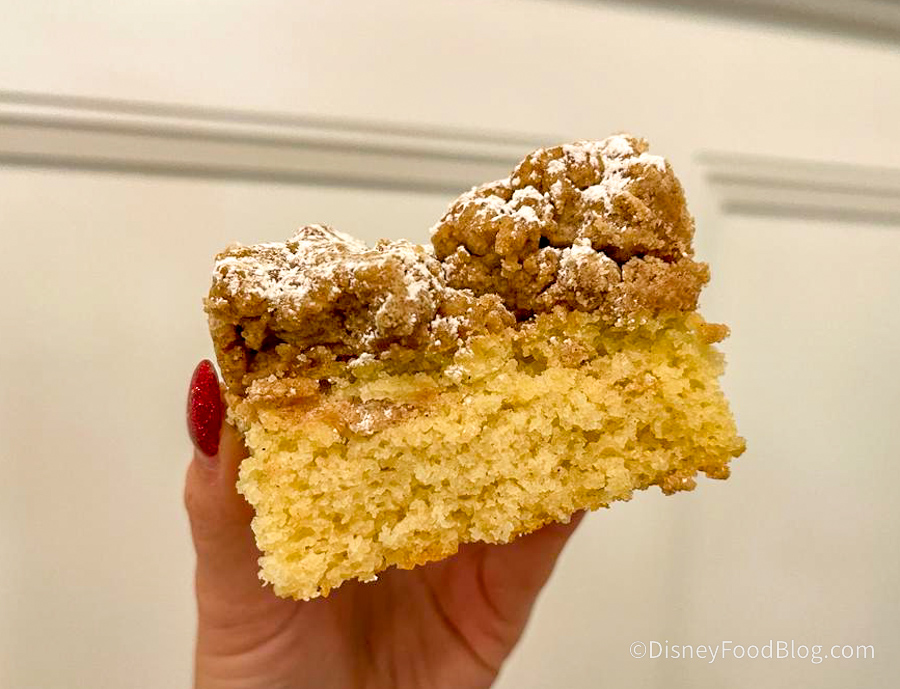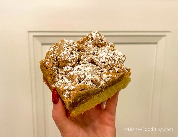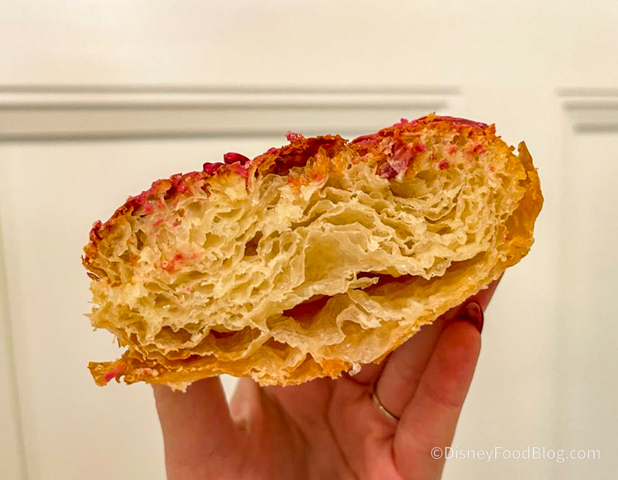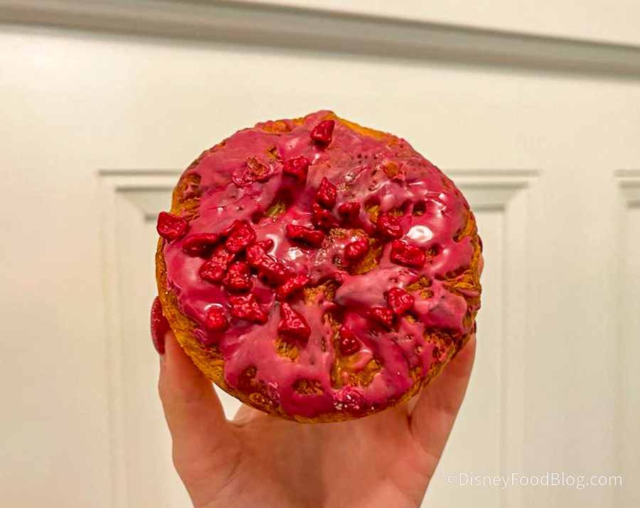 Next up, we had the Crunchy Raspberry Danish for $4.29 as well. This a flaky, raspberry danish with raspberry icing on top and raspberry crumble, and a layer of caramel. Oh MAN, this was so wonderful and different from anything we’ve had at Disney World. The crunchy bits on top are tart which helps to cut down on the sweetness from the rest of the dessert.