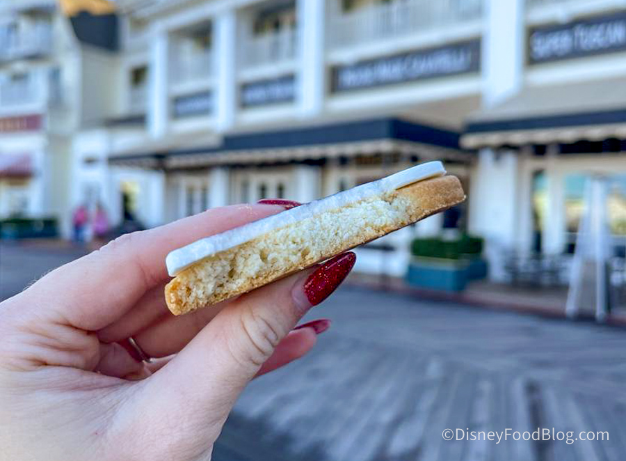 Of course, we had to try the Vintage Mickey Sugar Cookie for $4.29 too! This is a traditional sugar cookie with white icing and Mickey (or Minnie) printed onto it. While this is an adorable (and quite photo-worthy) snack, it didn’t wow us. It’s a pretty standard sugar cookie, and was pretty crunchy and dry.