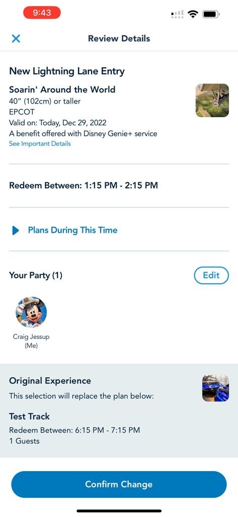 If we had CANCELED that reservation and then booked Soarin’, our window to book a new reservation would have updated to 11:43 a.m. BUT, we chose to MODIFY our plan and select the Soarin’ Lightining Lane instead of the later Test Track one. Our window to book a new reservation remained the same — 11 a.m. So, we got the same Lightning Lane reservation, but we saved ourselves from having to wait an additional 44 minutes to book the next one.