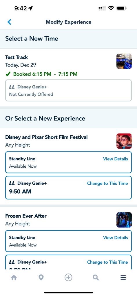 But then, at 9:39 a.m., we changed our minds about that 6:15 p.m. Test Track. We decided to book a Lightning Lane for Soarin’ Around the World at 1:15 p.m. We didn’t want to wait until 11 a.m. and possibly lose the chance to ride Soarin’ earlier in the day. When this happens to you, there are TWO options — you can CANCEL your Test Track Lightning Lane, freeing you up to book another reservation, or you can MODIFY your experience. When we chose to modify our experience, the app offered us the choice to select a new time for Test Track, or select a new experience.