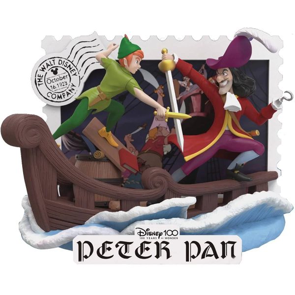 First, we have the Disney 100 Years of Wonder Peter Pan, outlined with a stamp design as the frame. In this 6-inch statue, you can see Peter Pan fighting his arch nemesis, Captain Hook!