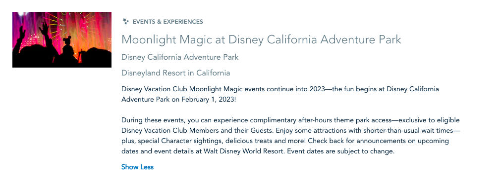 Think of Moonlight Magic like After Hours events specifically for Disney Vacation Club members. These events returned to Disney World in 2022, and now they’re coming back to Disneyland Resort in 2023. The first returning Moonlight Magic will take place at Disney California Adventure on February 1st.