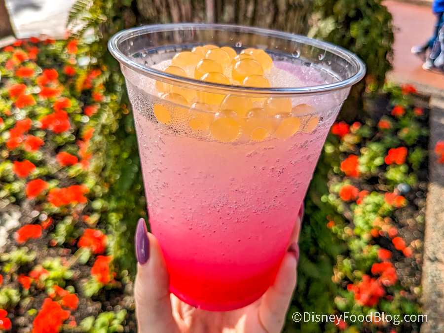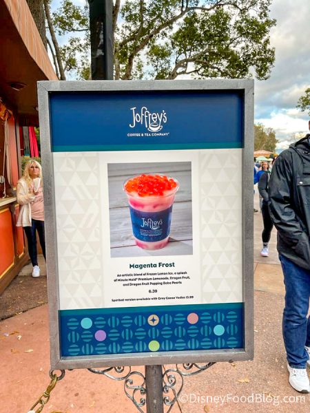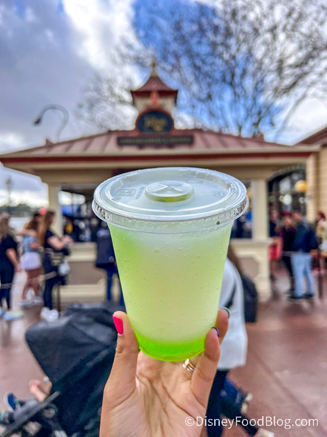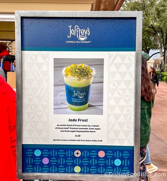 - World Showcase (Near Disney Traders) – Jade Frost: An artistic blend of frozen lemon ice, a splash of Minute Maid Premium Lemonade, green apple, and green apple popping boba pearls (New) — $6.39; (Alcoholic version available with Grey Goose Vodka — $13.99)