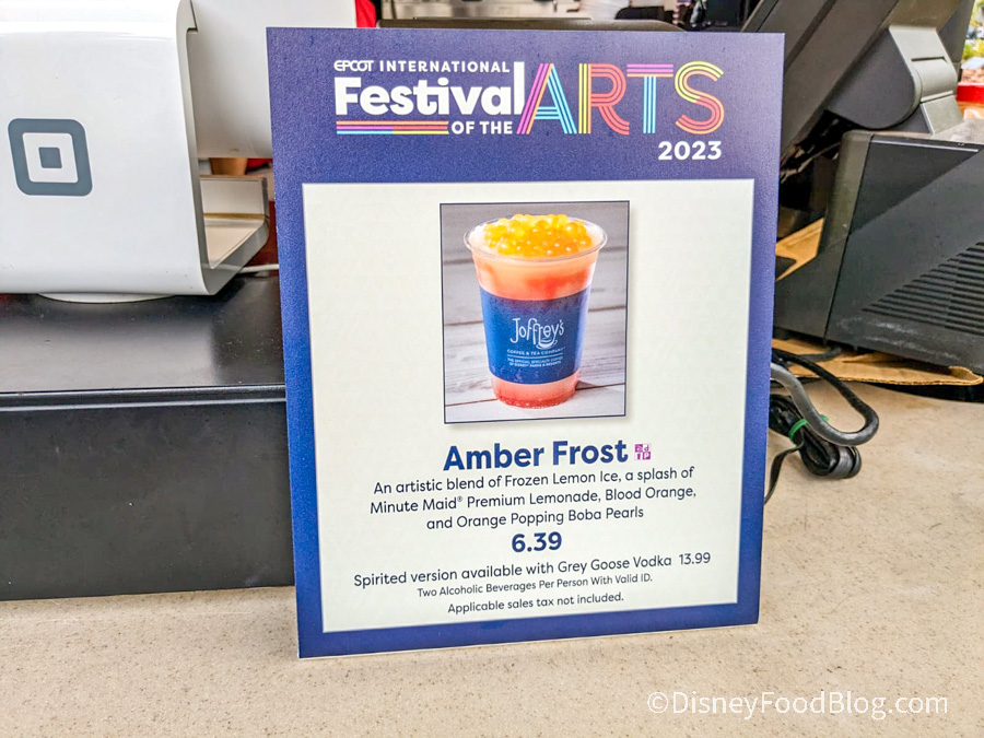- World Discovery (Near Mission: SPACE) – Amber Frost: An artistic blend of frozen lemon ice, a splash of Minute Maid Premium Lemonade, blood orange, and orange popping boba pearls — $6.39 (New) (Alcoholic version available with Grey Goose Vodka — $13.99