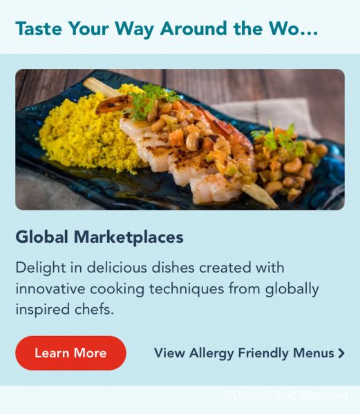 When you click the “View Allergy Friendly Menus,” you can find items that are friendly for guests with gluten/wheat, egg, soy, peanut/tree nut, milk, sesame, fish/shellfish and other allergies. (Please be aware that Disney states the following regarding the Global Marketplace Booths: “We use reasonable efforts in our food preparation and handling procedures to avoid the introduction of the most common allergens into your menu choices. While we take steps to prevent cross-contact, we do not have separate allergy-friendly kitchens and are unable to guarantee that a menu item is completely free of allergens.”)