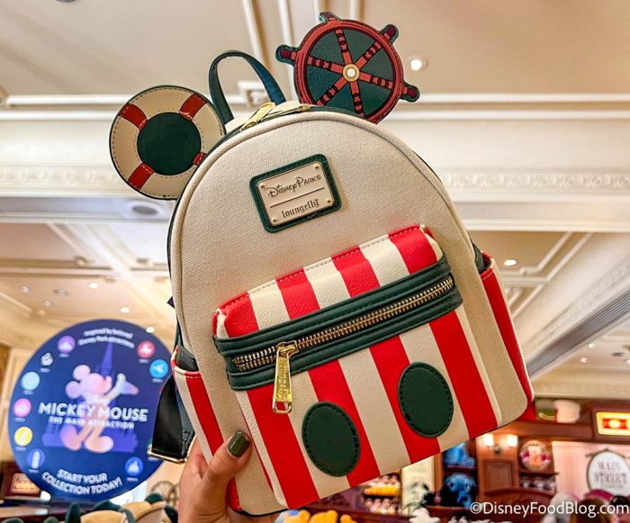 The Mickey Mouse: The Main Attraction Jungle Cruise collection can now be found at Magic Kingdom and EPCOT! We spotted the items at the Emporium and Creations Shop. The new Loungefly bag has white and red stripes along with Mickey ears in the shape of a stern wheel and a life preserver.
