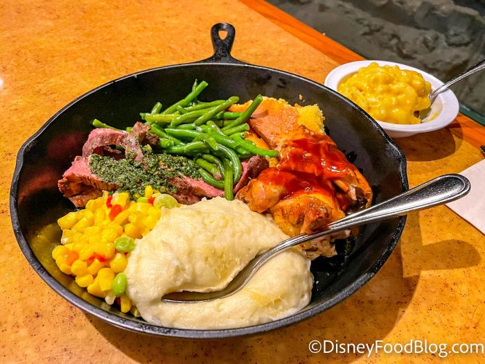 Moving on in Animal Kingdom, let’s check out Flame Tree Barbecue on Discovery Island! Here you can find things like chicken, ribs, pulled pork, and baked macaroni and cheese. The entrees are between $11.79 and $16.49 and come with a lot of food.