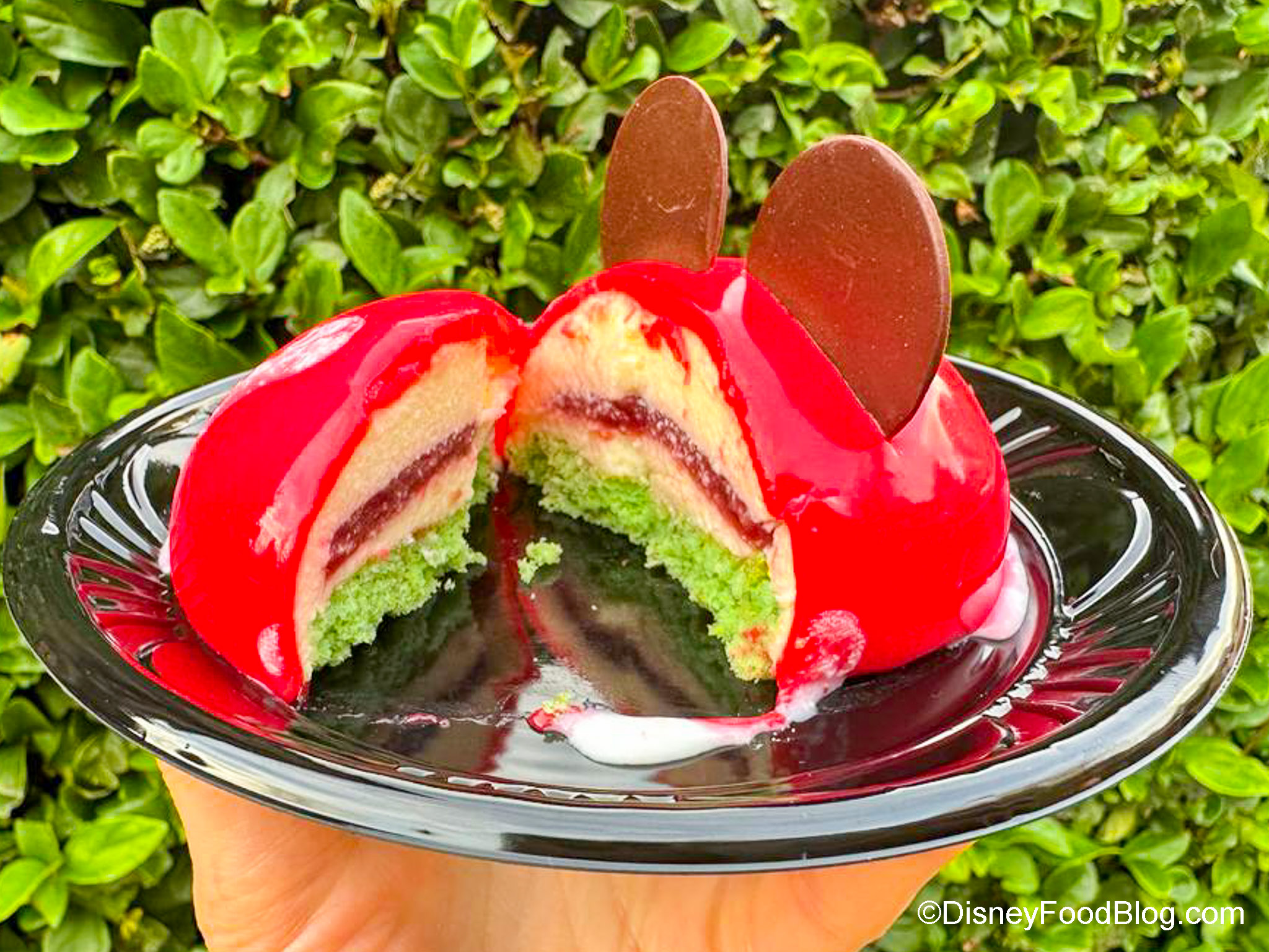 The Minnie Dome Cake is made with a vanilla citrus mousse with a strawberry glaze on top of pistachio cake, and dark chocolate ear coins. Let’s start with the mousse — it’s light and creamy with a citrusy kick. The pistachio cake also had a really good flavor, but it was mild. The chocolate ears are made with dark chocolate, so make a note if you don’t like a more bitter chocolate.