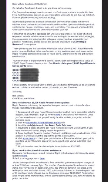 In the email, Bob Jordan, the CEO, shares that he knows “no amount of apologies can undo your experience,” and reassures that the company is working hard to make it right. Requested returns, reimbursements, and lost baggage processes are “being handled with great urgency.” Lastly, they have issued 25,000 Rapid Rewards® bonus points (per person) to those affected by the disruptions. According to Southwest, “these points equate to a redemption value of over $300.”