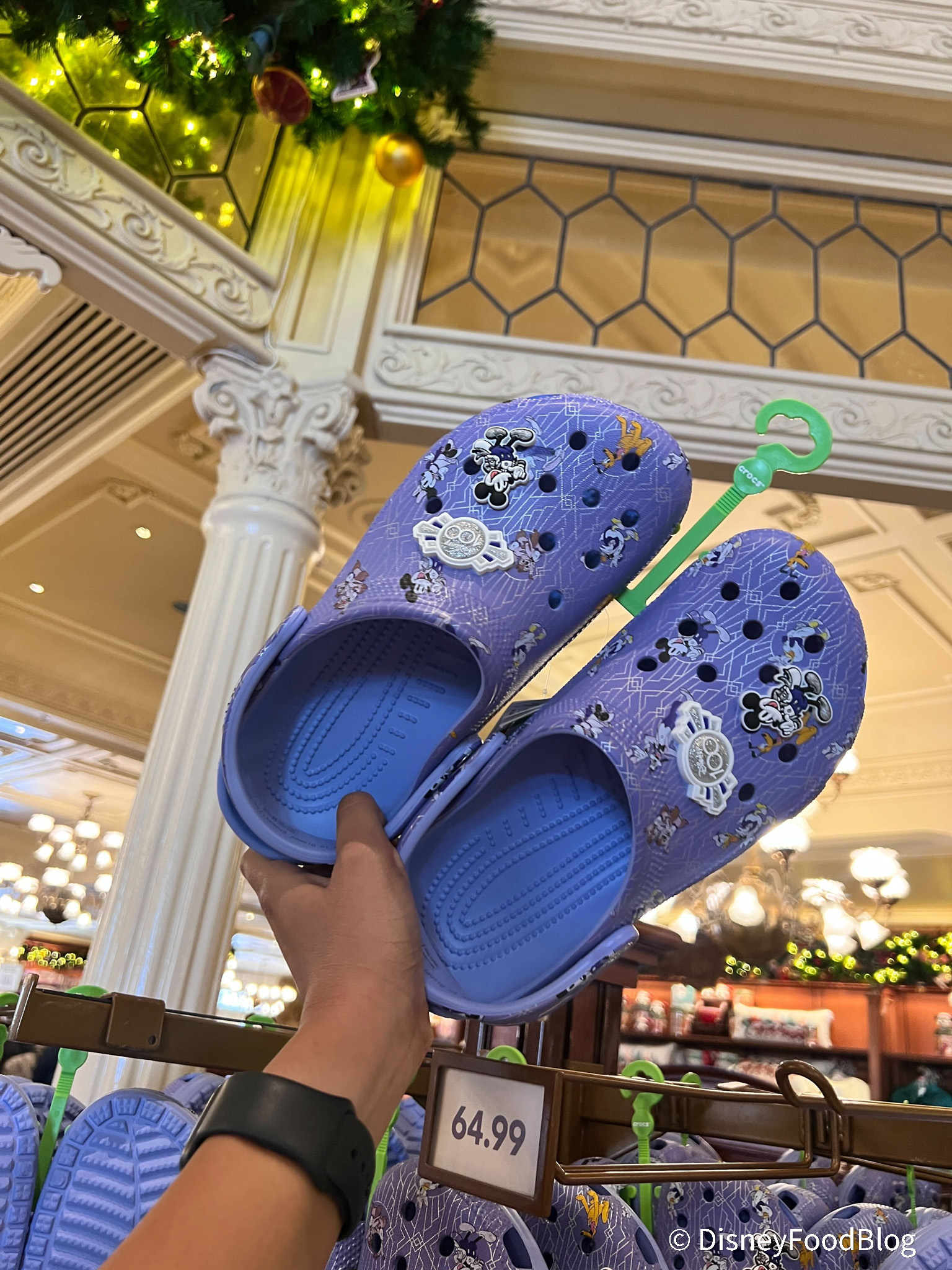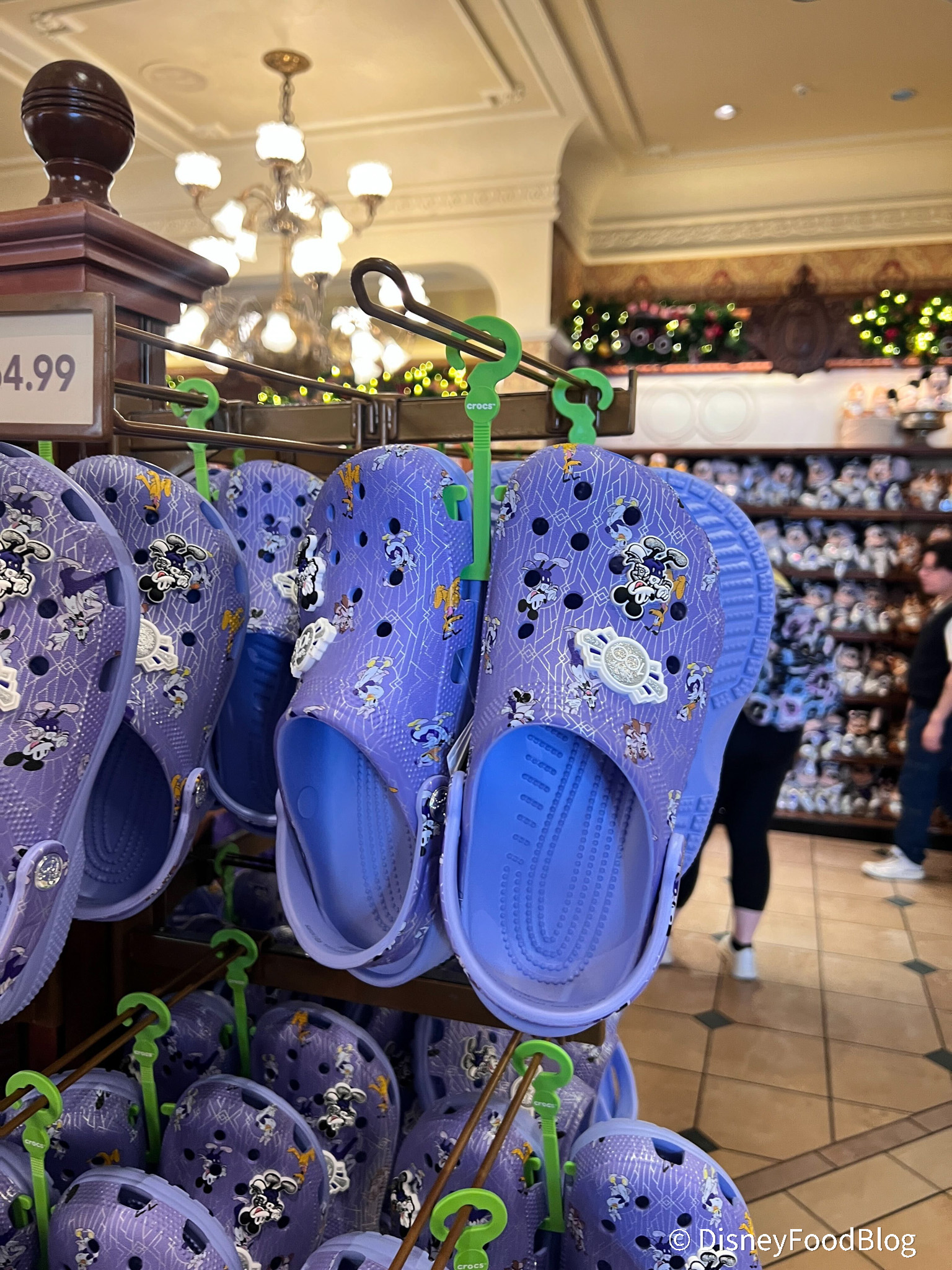 Another Disney100 item to arrive in Magic Kingdom is these Crocs! These classic clogs are in the same periwinkle shade we’ve seen across other 100th anniversary merch. They’re covered in classic characters like Mickey, Pluto, and Minnie all dressed up in their platinum outfits.
